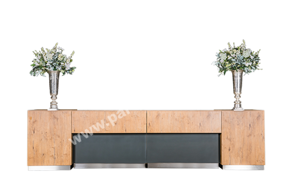 A bar from our Duplex loft-style furniture collection, characterised by clean aesthetic lines that enhance the impressive industrial look. It is a professional bar with a stainless steel construction clad on three sides with a glossy artificial stone slab, which is equipped with a stainless steel trench bar above the ground. The top is polished stainless steel with raised edges and conforms to professional bar standards. The extension comes in light oak wood. The bars have locking feet with protective end caps against floor abrasion.  Duplex bars are variably assembled into rows and different shapes. Combination with other Duplex segments is possible. An inner white shelf for inventory and goods can be ordered for the inner empty space of the bar. This shelf is not included in the price of the bar.