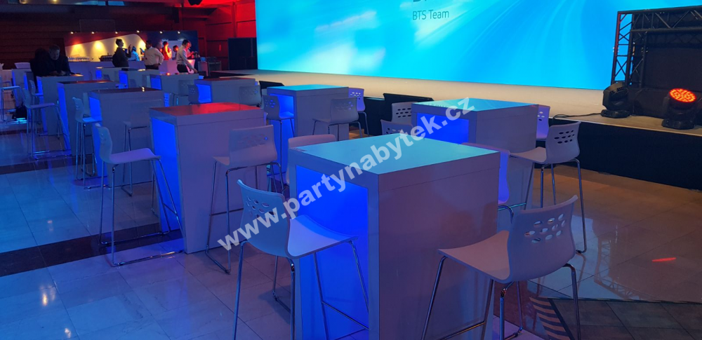 Luxusní koktejlový stůl ve špičkové kvalitě zpracování a použitých materiálů vyniká svojí jednoduchou linií. Minimalistický a čistý design dodá eleganci každé akci. Boční panelové nohy zajišťují mimořádnou stabilitu. Stůl je precizně zpracován kvalitní tuzemskou zakázkovou výrobou. Jedná se o dřevěný masiv potažený tvrzeným laminátem s povrchovou úpravou ve vysokém lesku. Zespodu stolové desky je umístěno světlo s vlastním zdrojem (bez kabelu). Světlo lze ovládat dálkovým ovladačem s možností různých barev. Stoly mají ochranné koncovky nohou, proti oděru podlahy. Exklusivní stůl vhodný pro použití bez ubrusu.