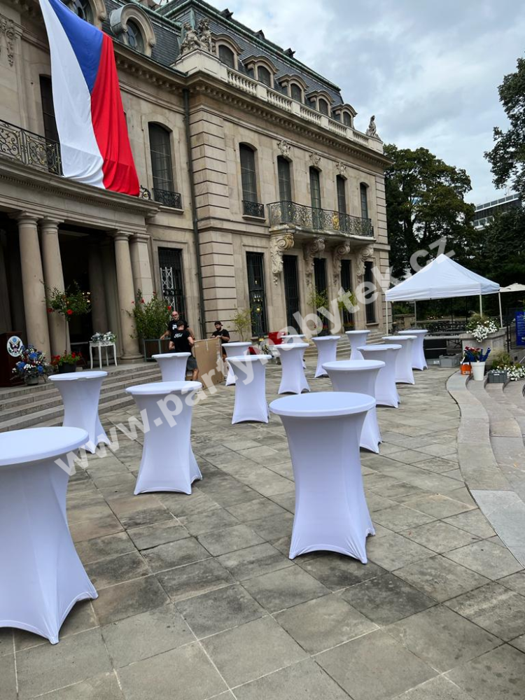 Cena setu : plastový bistrostůl pr. 80 cm, elastický ubrus, elastický potah na desku (čepice).