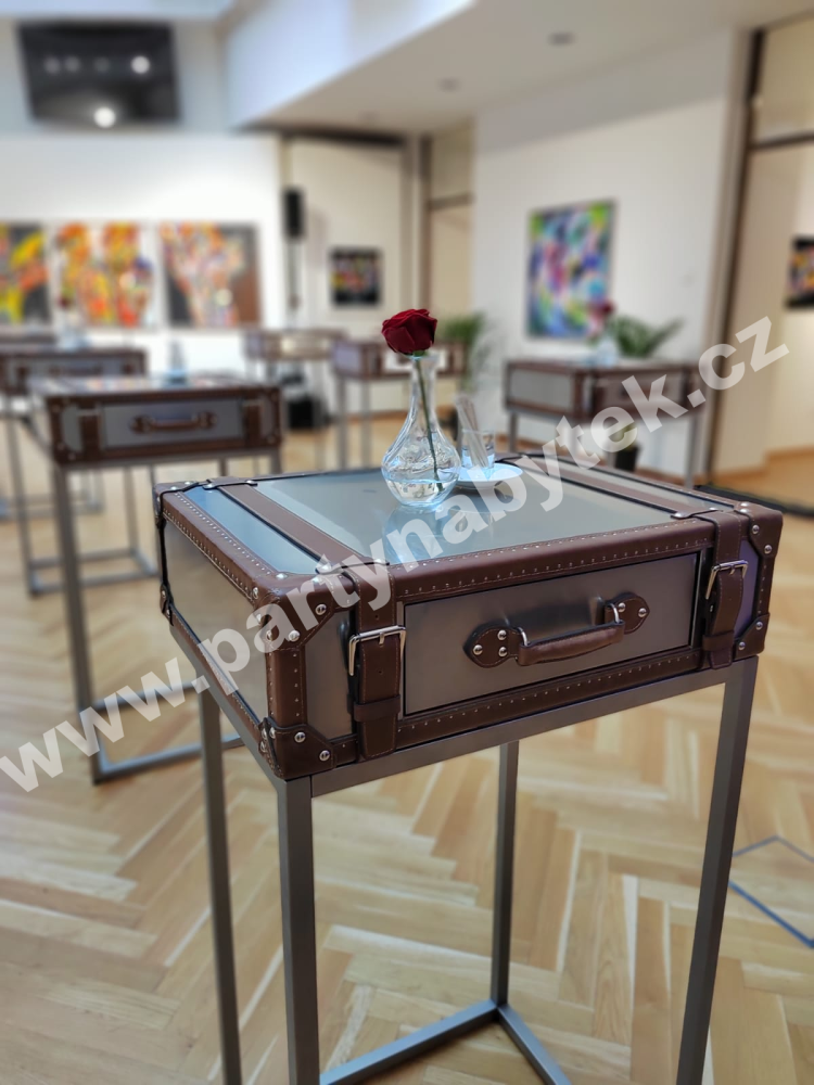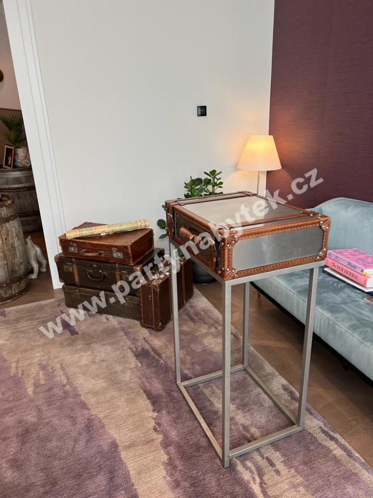 Pokud toužíte po elegantním nábytku jako z anglického klubu gentlemanů, pak impozantní party stoly v provedení starého cestovního kufru Vaše přání bezezbytku splní. Jsou určeny milovníkům skotské whisky a doutníků, kteří se nebojí odlišovat a hledají luxus v každém detailu. Nadčasová klasika působící noblesním dojmem ... štíhlá nerezová konstrukce nesoucí precizně zpracovanou desku v imitaci staroanglického cestovního kufru. Deska kufru je z nerezu, bohatě zdobená přezkami a rámováním z pravé hnědé kůže. Konstrukce z kartáčované nerezové oceli je opatřena aretovacími nožkami s krytkami proti oděru podlahy.