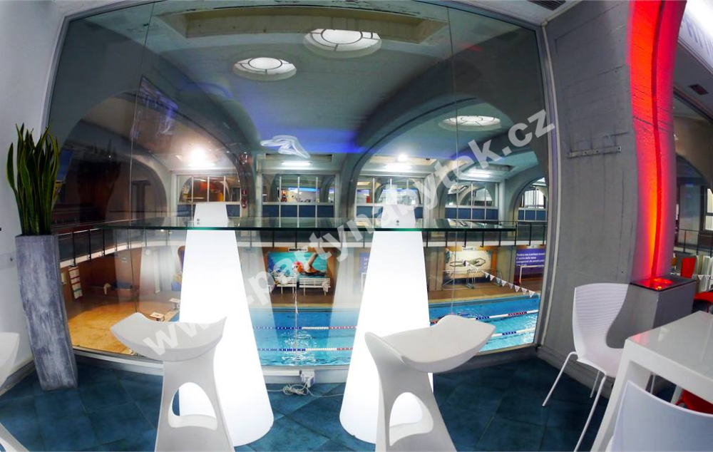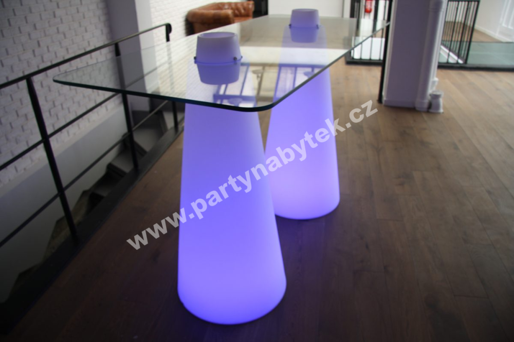 Stůl má celkovou výšku 120 cm, přičemž obdélníkovou desku z čirého skla rozměru 180x80 cm, která je ve výšce 110 cm, nesou 2 kuželovité polyethylenové nohy.  Uprostřed obou kuželovitých základen je prostor, do kterého lze vložit chladič na láhve (není součástí ceny půjčovného), květinu nebo občerstvení. Díky jemnému světlu, které stůl vyzařuje, se podaří vytvořit kouzelnou atmosféru každého prostoru.