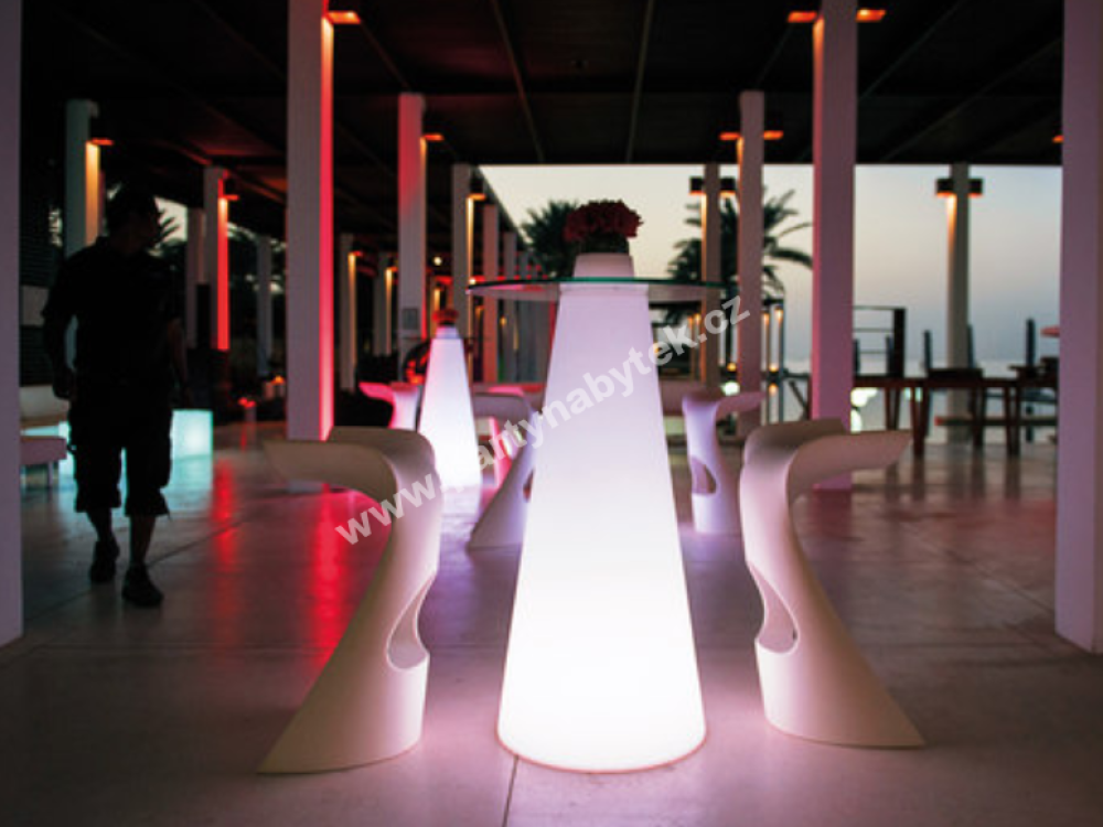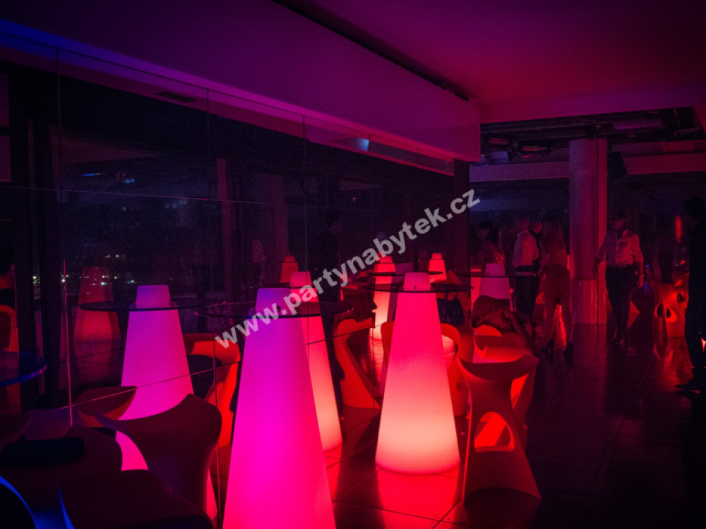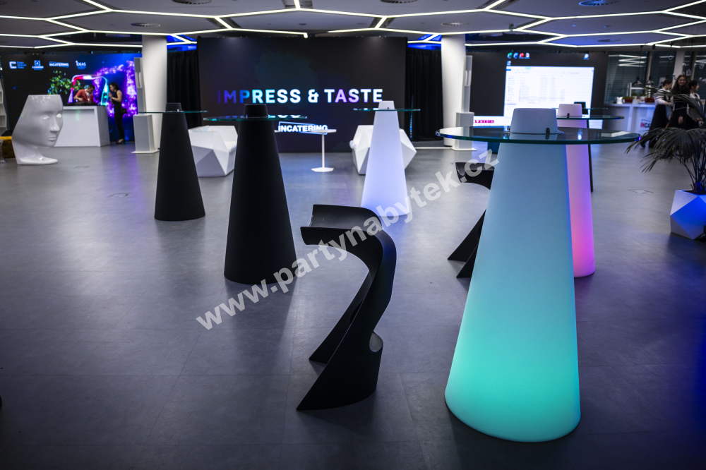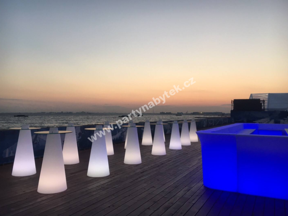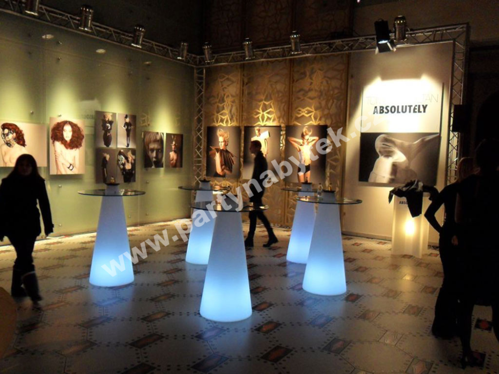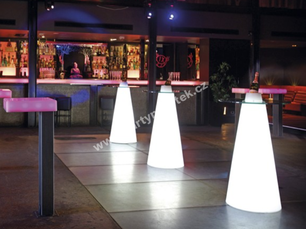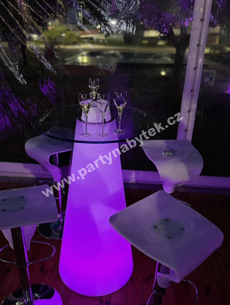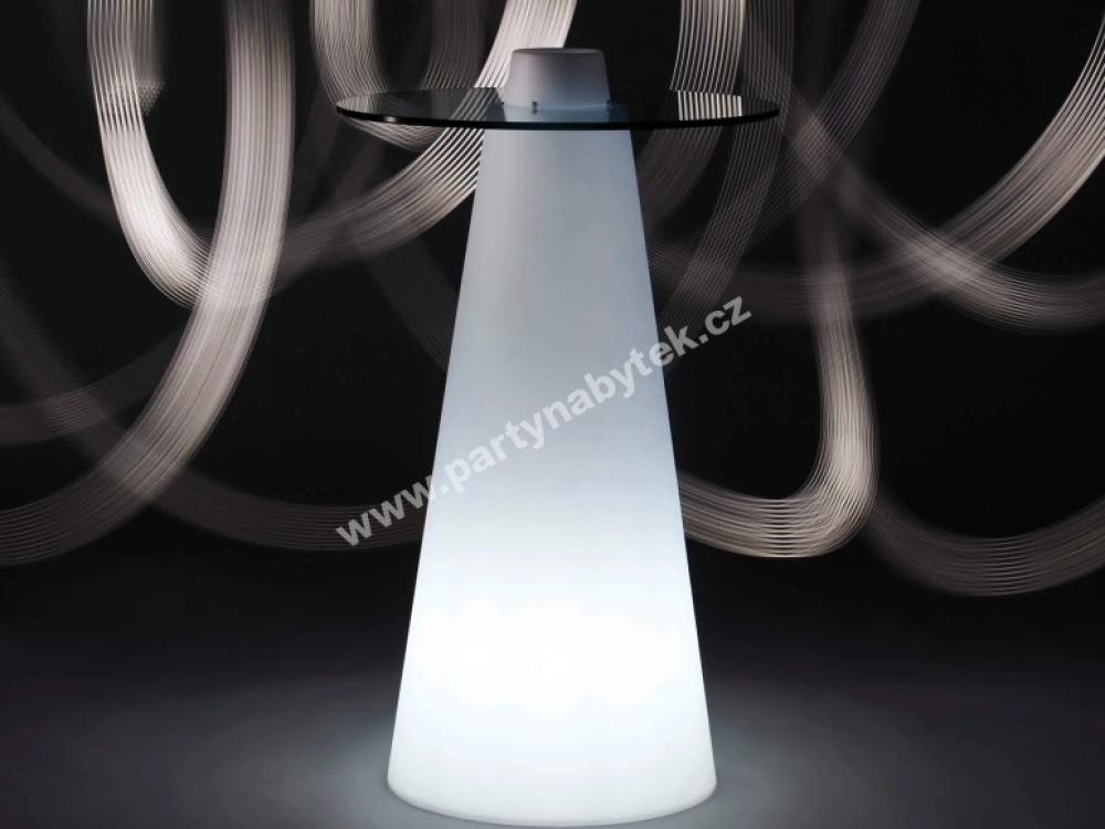 Stůl má celkovou výšku 120 cm, přičemž kulatá deska z čirého skla o pr. 70 cm je ve výšce 110 cm.  Uprostřed kuželovitého základu stolu je prostor, do kterého lze vložit chladič na láhve (není součástí ceny půjčovného). Díky jemnému světlu, které stůl vyzařuje, se podaří vytvořit kouzelnou atmosféru každého prostoru.