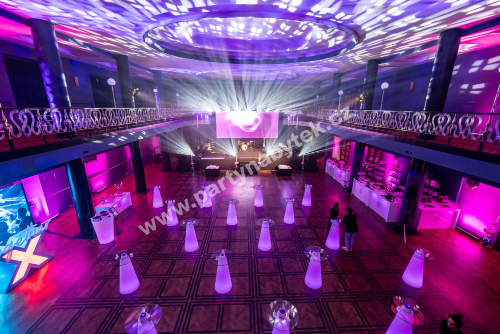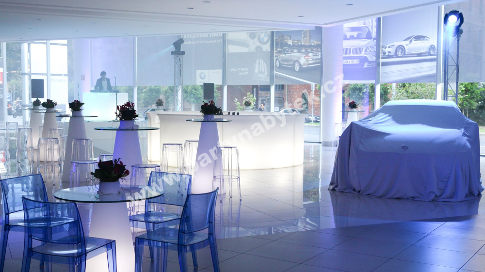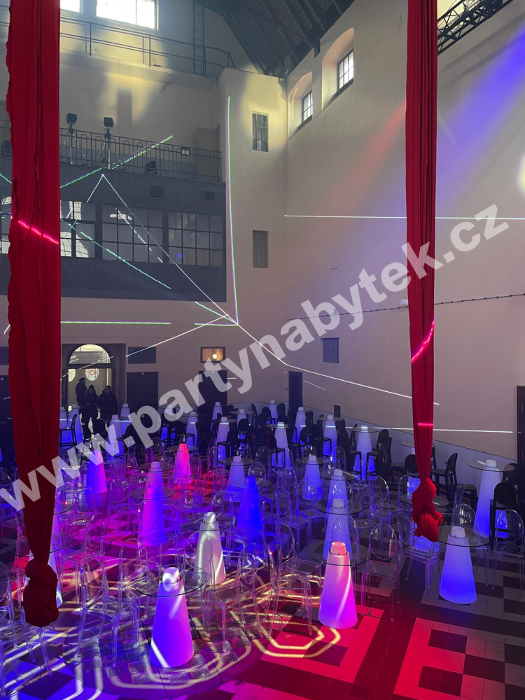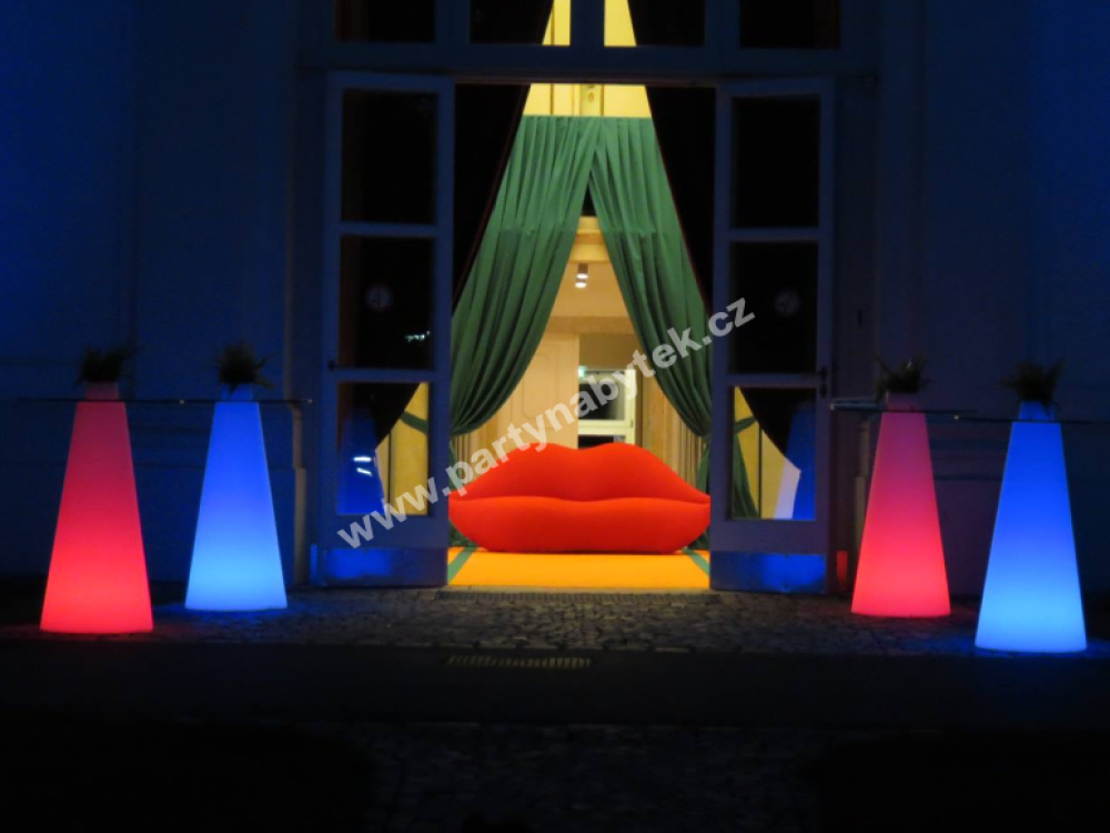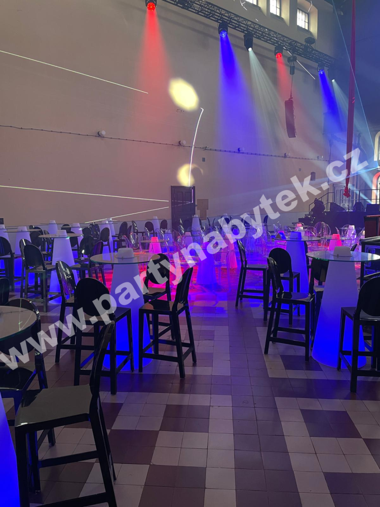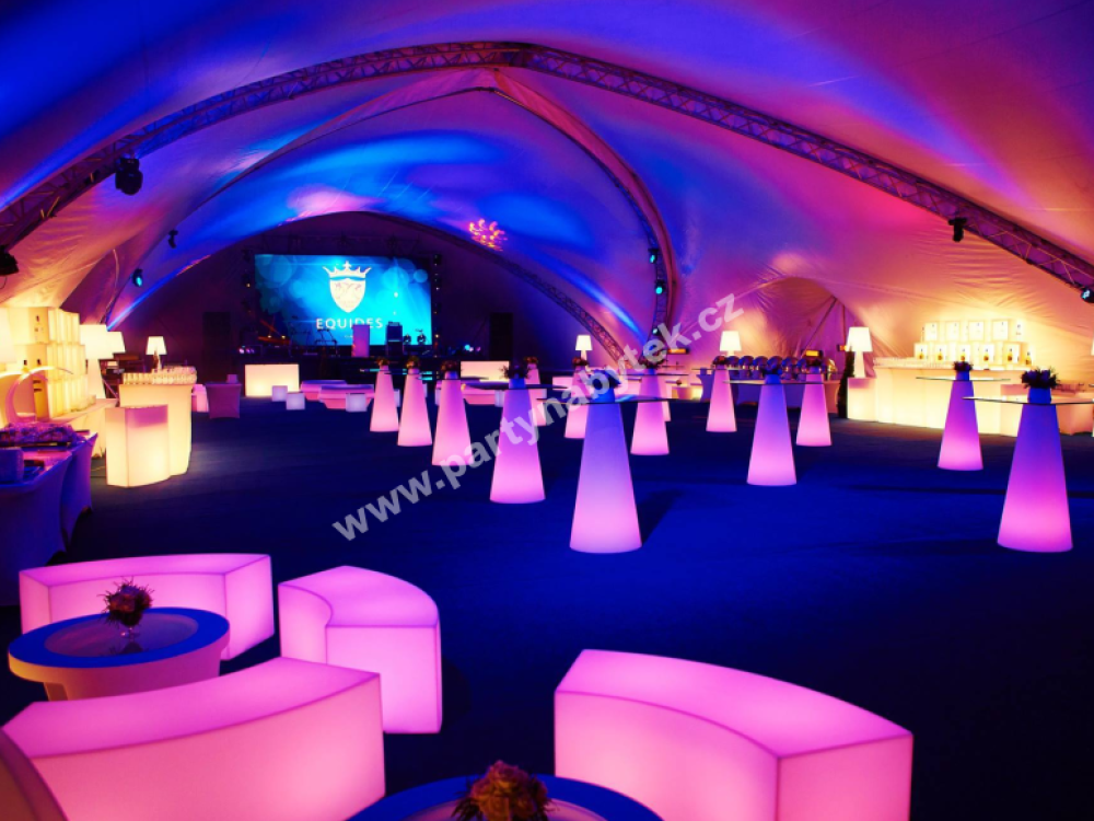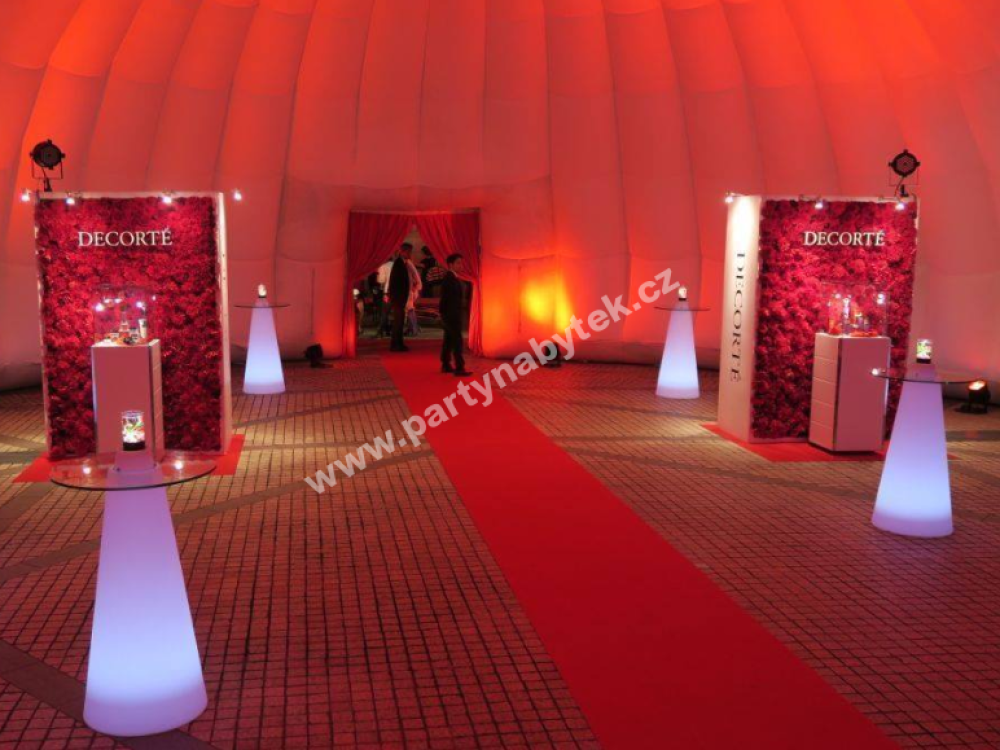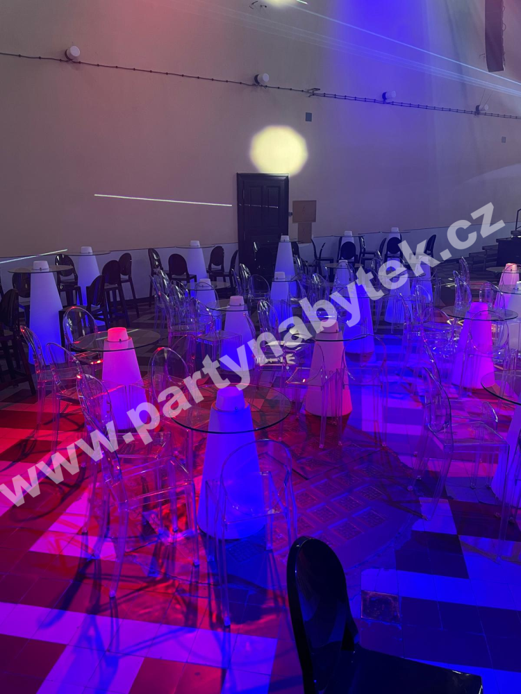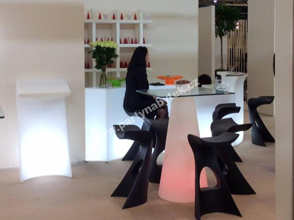 Stůl má celkovou výšku 120 cm, přičemž kulatá deska z čirého skla o pr. 70 cm je ve výšce 110 cm.  Uprostřed kuželovitého základu stolu je prostor, do kterého lze vložit chladič na láhve (není součástí ceny půjčovného). Díky jemnému světlu, které stůl vyzařuje, se podaří vytvořit kouzelnou atmosféru každého prostoru.