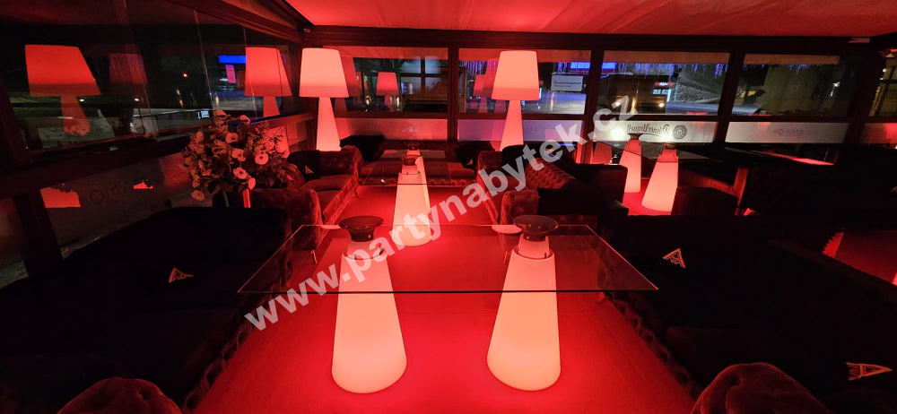 Stolek je doplněn 2 x RGB LED podsvícením na baterii, s dálkovým ovládáním, které umožňuje funkce různých barev a intenzity. Svítí s vlastním zdrojem bez kabelu, s výdrží cca 8 hodin.