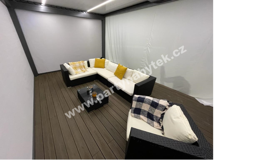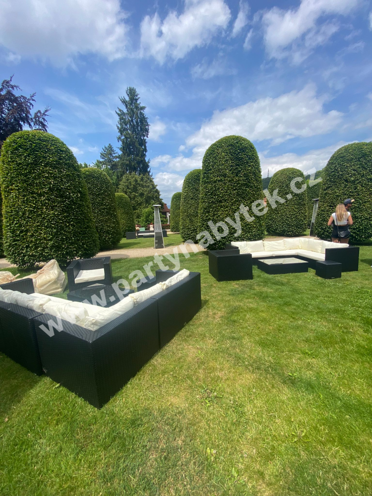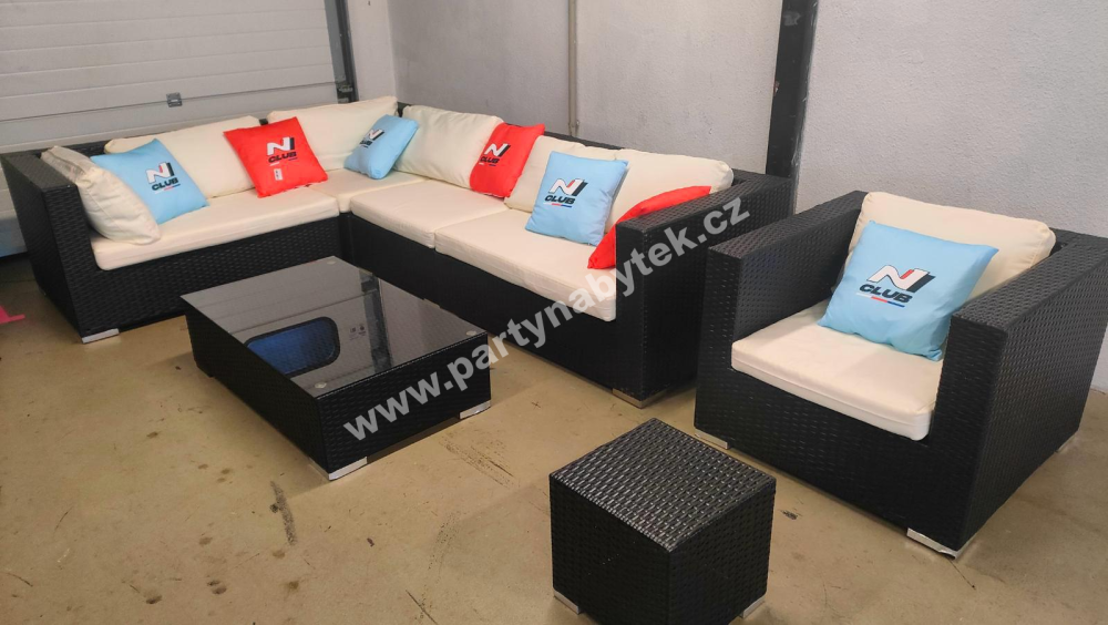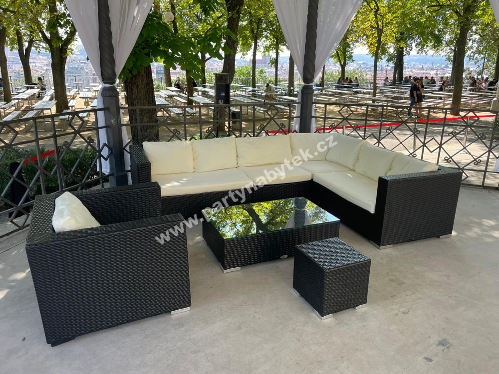 Nadčasová a elegantní souprava z vyplétaného umělého ratanu, použitelná v interiéru i exteriéru. Pevná hliníková konstrukce je ručně vyplétána speciálními vlákny syntetického ratanu v černé barvě a pro manipulaci je velice lehká. Vyplétaný sedák je lemován robustními područkami a opěrákem ve stejné výšce, což vytváří pohodlí a moderní design. Vysoké a měkké odnímatelné sedáky i opěráky jsou čalouněny světle krémovým potahem. Souprava je libovolně sestavitelná do tvaru “L” s různě dlouhými stranami. Souprava se skládá ze 2 dvousedáků, 2 jednosedáků, rohu, samostatného křesla, taburetu a obdélníkového stolku se skleněnou deskou.