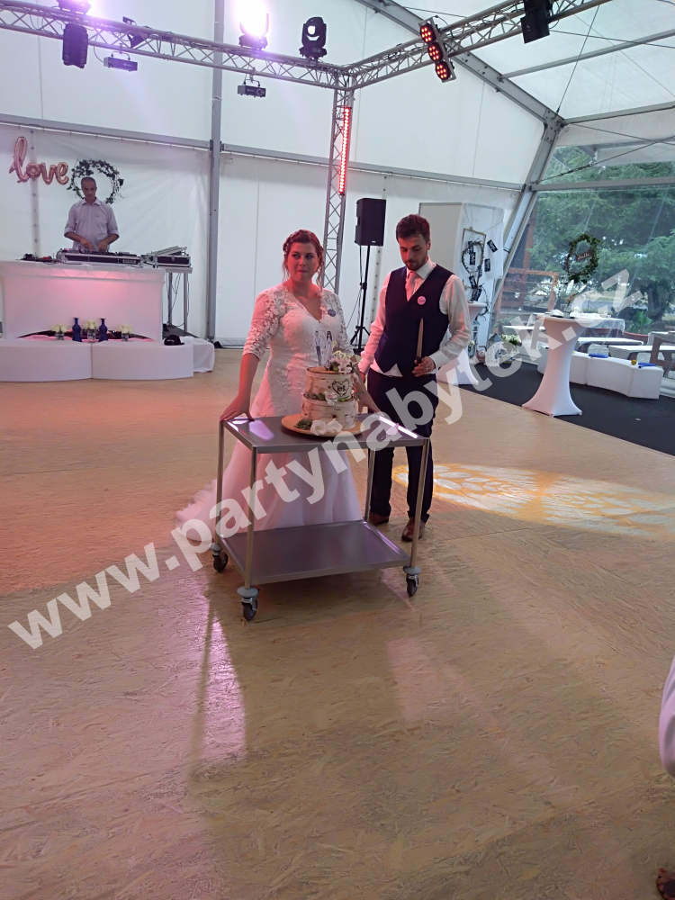 Dvoupatrový servírovací stolek na kolečkách z chromované konstrukce a dvou chromovaných desek, bez rukojeti. Vhodný na servírování dortů.
