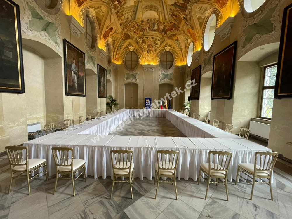 Sukně je vyrobena z kvalitní směsi bavlny a polyesteru a díky své gramáži 224g/m2  je velmi kvalitní. Tato vysoká hustota zaručí, že sukně dobře drží tvar a na první pohled působí velice kvalitním dojmem. Sukně je hladká, bez vzoru, celá ušitá z jednoho kusu látky, opatřená suchými zipy, které se upevňují na spony. Spony je třeba objednat zvlášť. Na 1 metr doporučujeme 4 spony. Spony si vyberte velké nebo malé dle dloušťky desky stolu. Tato sukně je vhodná na stoly rozměru 120x80, 120x68 nebo 152x76 cm.