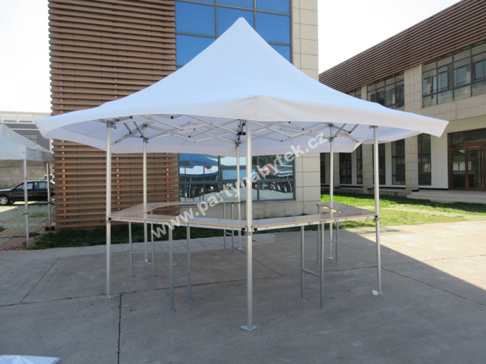 Hliníkový stůl s dřevěnou deskou se zkosenými stranami vhodný jako pult po obvodu stanu Hexagon. Lze půjčit pouze jako kompletní sada 5ti stolů včetně bílých polobočnic. Cena je za kompletní sadu. Polobočnic je 5 kusů stejně jako stolů a jsou vysoké 1 m.