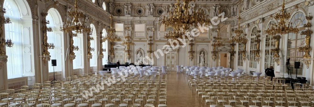 Jedinečné židle starožitného napoleonského vzhledu, splňující normy CATAS – ideální židle pro náročné veřejné prostory. Jedná se o jedny z celosvětově nejrozšířenějších eventových židlí, splňující jakékoliv požadavky – jsou krásné, pohodlné, lehké, avšak velmi stabilní. Zlatý korpus židlí z pryskyřicové směsi je krásně zdobený, opatřený pohodlným semišovým sedákem v bílé barvě.