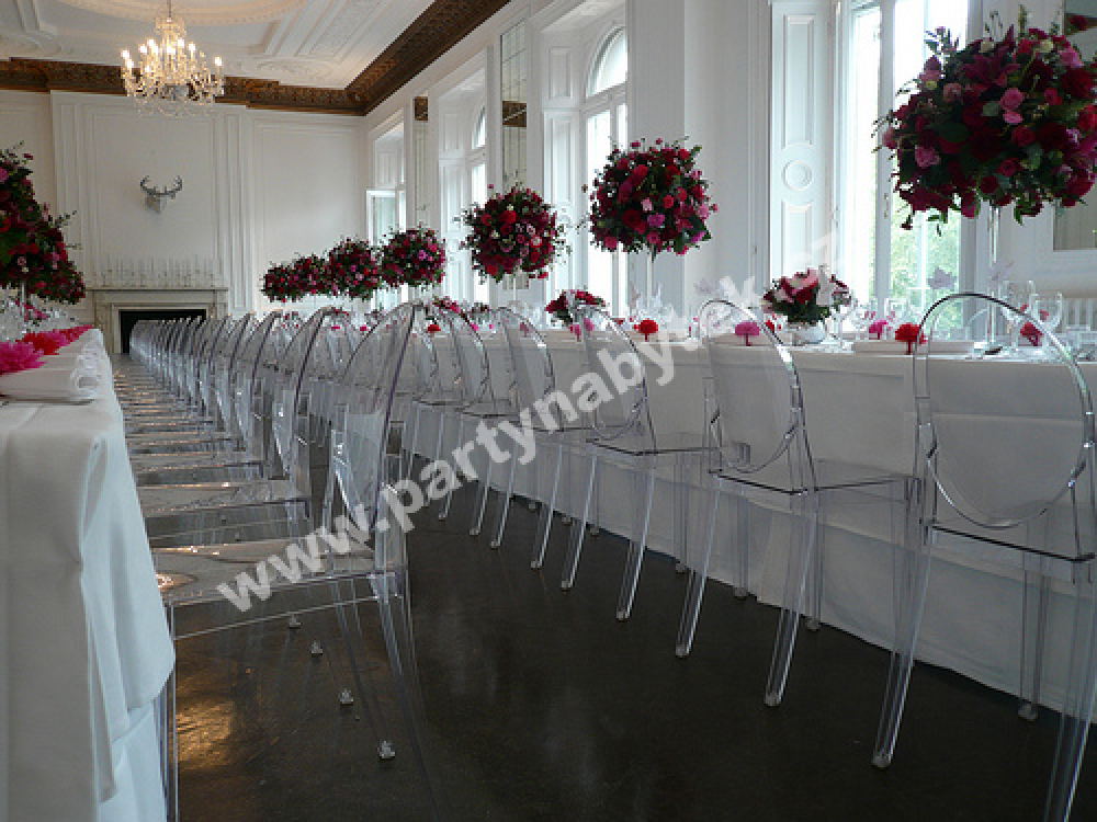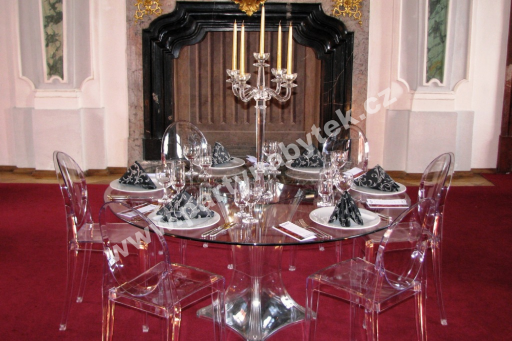 Reprezentativní židle v moderně barokním stylu Ludvíka XV., inspirované projektem Louis Ghost, budou šperkem každé akce a dodají jí punc královské hostiny. Zakulacené opěradlo připomíná svým tvarem starý medailon, zatímco sedák je lineární a geometrický. V tomto průhledném provedení působí lehce a elegantně. Jsou vyrobeny z extrémně kvalitního polykarbonátu, proto jsou lehké a přitom vysoce odolné.